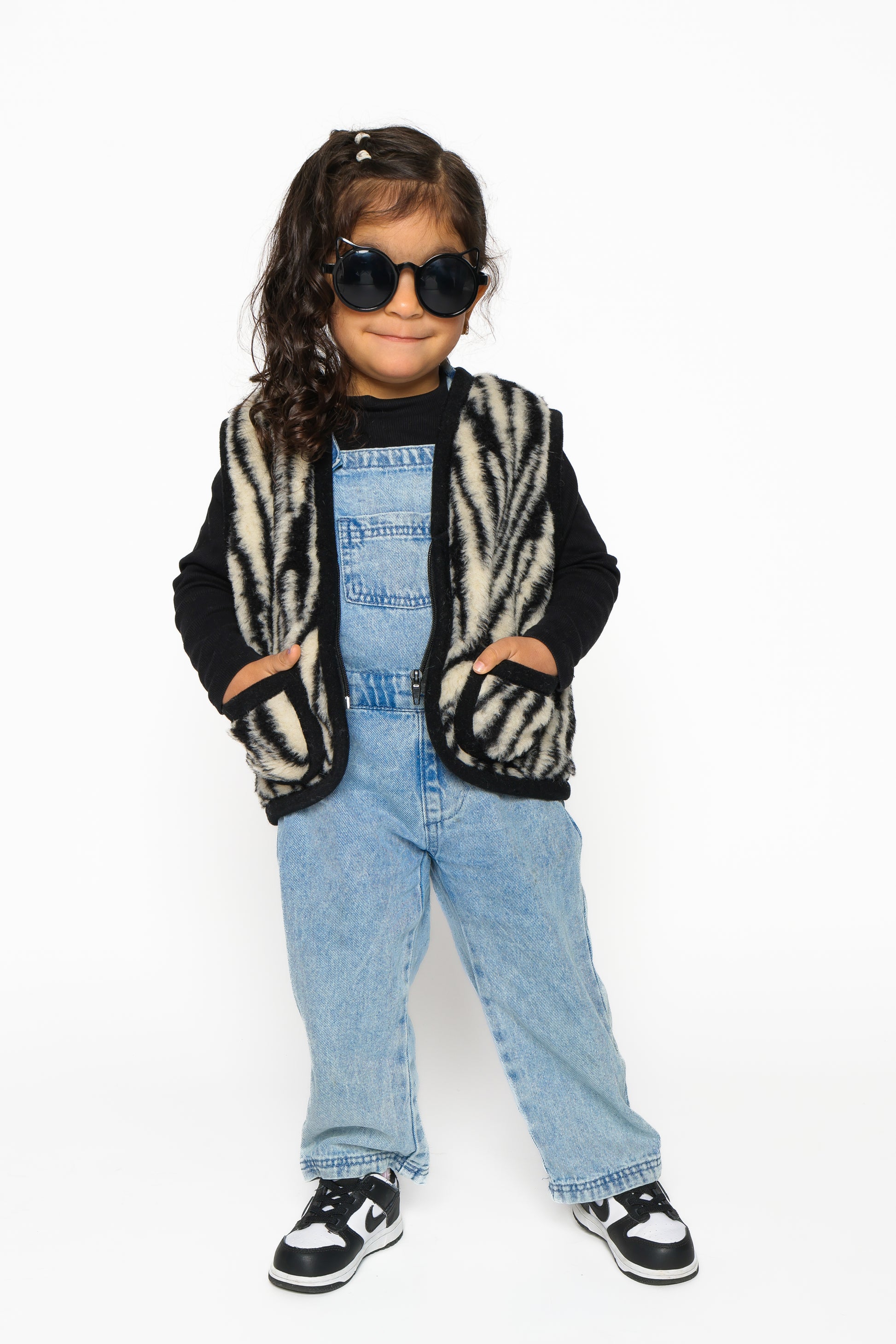 Houd je kleintje warm én stijlvol met onze zachte wollen kinderbodywarmer in een speelse zebra print.